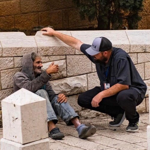 Bro Travis speaking to a homeless man on a domestic missions trip.